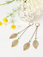 Boucles d'oreilles pendantes légères avec feuilles stylisées couleur bronze et petites perles vertes. Longueur totale 8cm