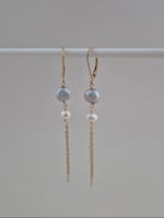 Boucles d'oreilles pendantes dormeuses et chaînettes fines en gold filled, légères et lumineuses avec deux petites perles de culture baroques grise et blanche, un bijou à porter en toute occasion discrètes et élégantes.
