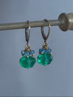 oucles d'oreilles pendantes vert émeraude en cristal de verre transparent, petite perle à facettes en verre de bohème et grappe de petites perles bleues en cristal de verre sur dormeuses en laiton.