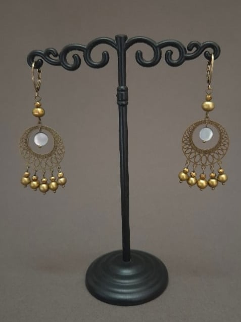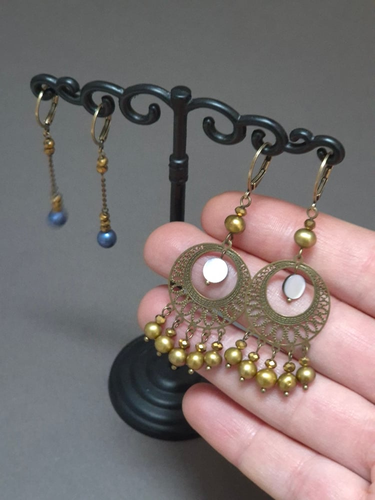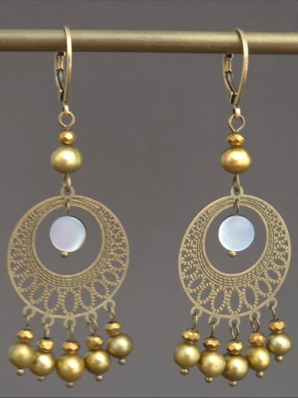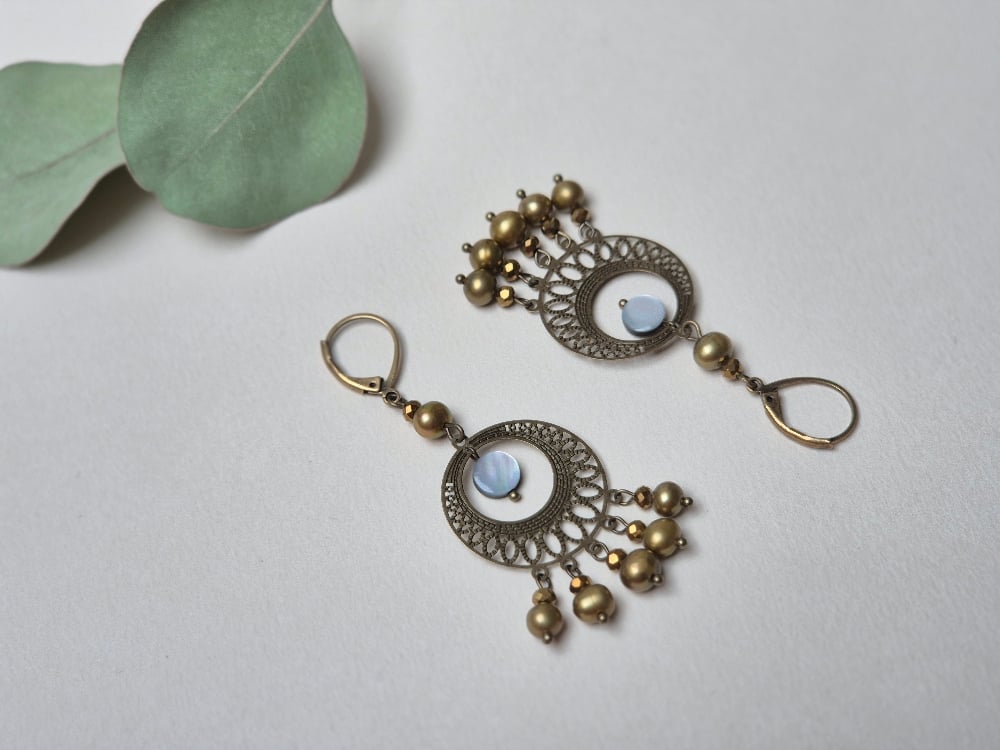 Boucles d'oreille dormeuses de style bohème en laiton patiné, petites nacres, cristal et perles naturelles.