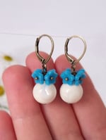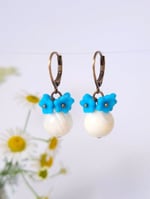 Boucles d'oreilles pendantes en nacre naturelle accompagnée de petites fleurs bleues en verre de bohème. Un bijou romantique à l’allure vintage, peut être porté lors d’un mariage ou en toute autre occasion spéciale.
