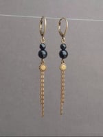 Boucles d'oreilles pendantes fines et légères composées de jolies pierres naturelles en agate noire facettées et petites chaînettes et pampilles soleil en laiton de couleur bronze.