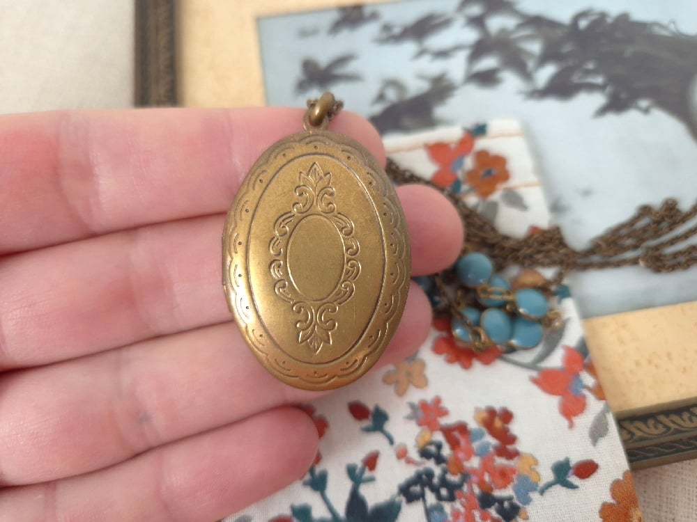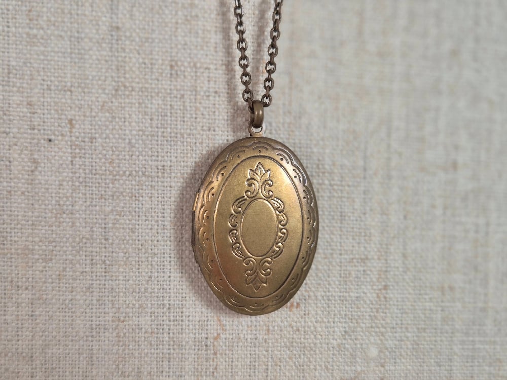 Long sautoir en laiton patiné avec pendentif médaillon à personnaliser avec 1 ou 2 photos
